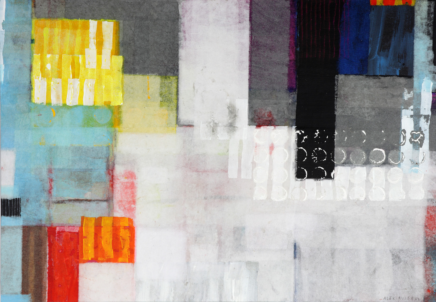 Alex Russell is a painter and printmaker. His process revolves around a multi-layered process of addition and subtraction. His mixed-media paintings and one-off prints are maps of their own making, visual records of routes found by the creative journey that celebrate the endless, joyful possibilities of colour, form and composition.