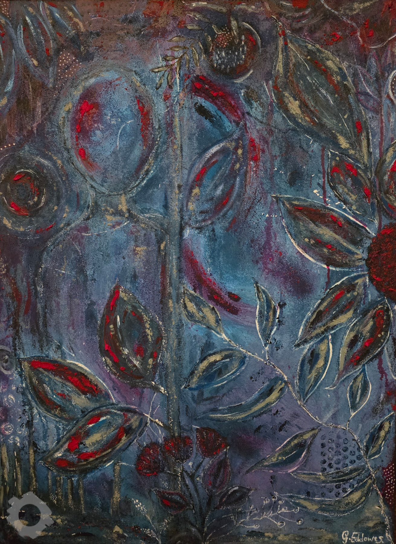 A Botanical Presence explores the quiet relationship between nature and being. Layered textures of acrylics, sand, pastels and charcoal create depth and movement, suggesting an unseen presence embedded within organic forms. The work invites stillness, allowing colour, mark and texture to evoke growth, memory and subtle awareness.