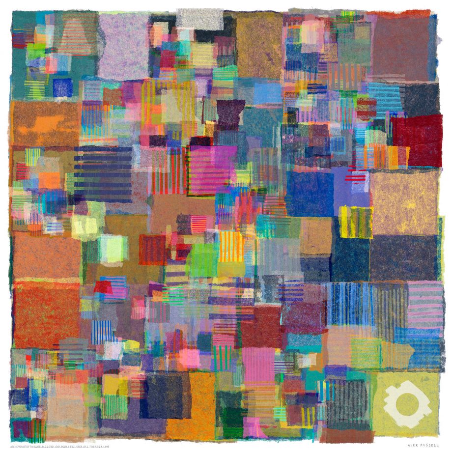 Alex Russell combines hand-made content with digital technology to make one-off prints and commissioned art. He creates libraries of images with traditional media and writes generative code to arrange them into artworks. His code mixes models of composition and colour (from art and design) with complex systems (from science and maths), creating unique outputs with every run. Alex develops algorithms that influence each other’s behaviour, governed by systems such as cellular automata to determine the characteristics of the content. The generative process works in two stages, using the biological concepts of genotypes and phenotypes to create a plan of the print and then build it. He works in series, each with its own themes, code and image library. Overarching everything is a conceptual approach to pattern, including design patterns (from software design) and pattern language (from architecture). Alex is intrigued by how traditions of arranging content can be expressed as a grammar, taking the rich history of print-making to a unique new place.