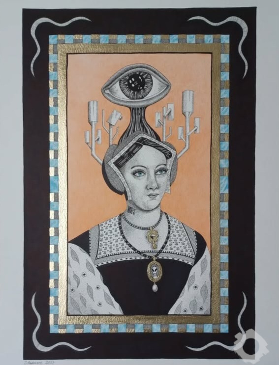 Zoe is also developing her practice into portraiture. The series blends contemporary figures with Tudor and Elizabethan influences, created in fine line pen and coloured pencil with touches of gold leaf. These works have led to commissions, including one from an emerging jazz duo.