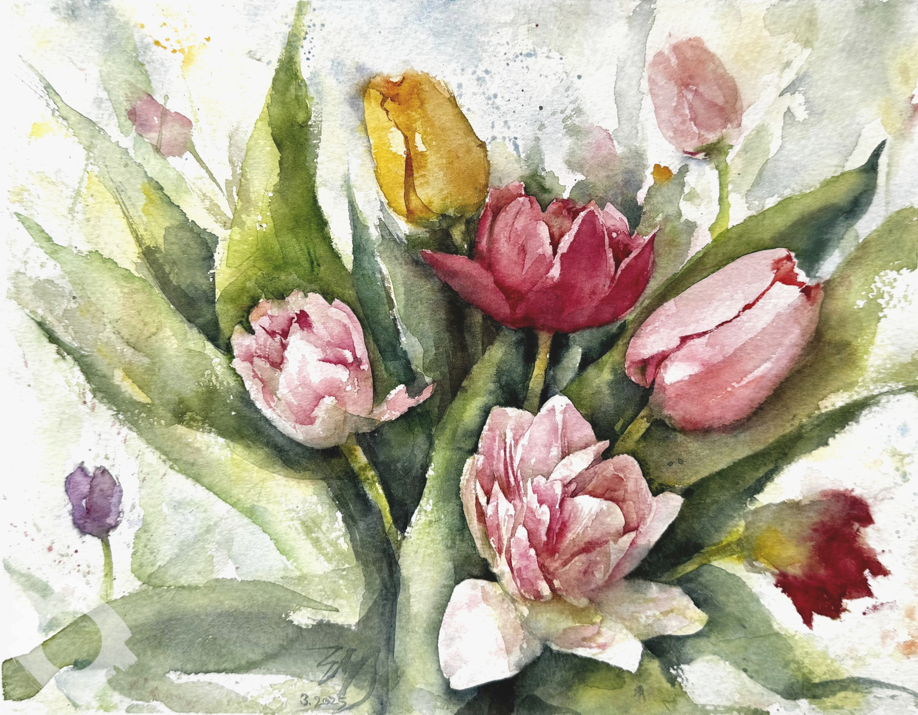Part of a twelve painting series, depicting each of the months of the year as different florals in watercolour. Framed in black with white mount.