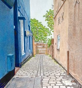 She photographs these hidden passageways, capturing their sense of history as the streets around them modernise. Images then become artworks using pointillism techniques with fine line pen, as well as acrylic paint and coloured pencil on textured watercolour paper.