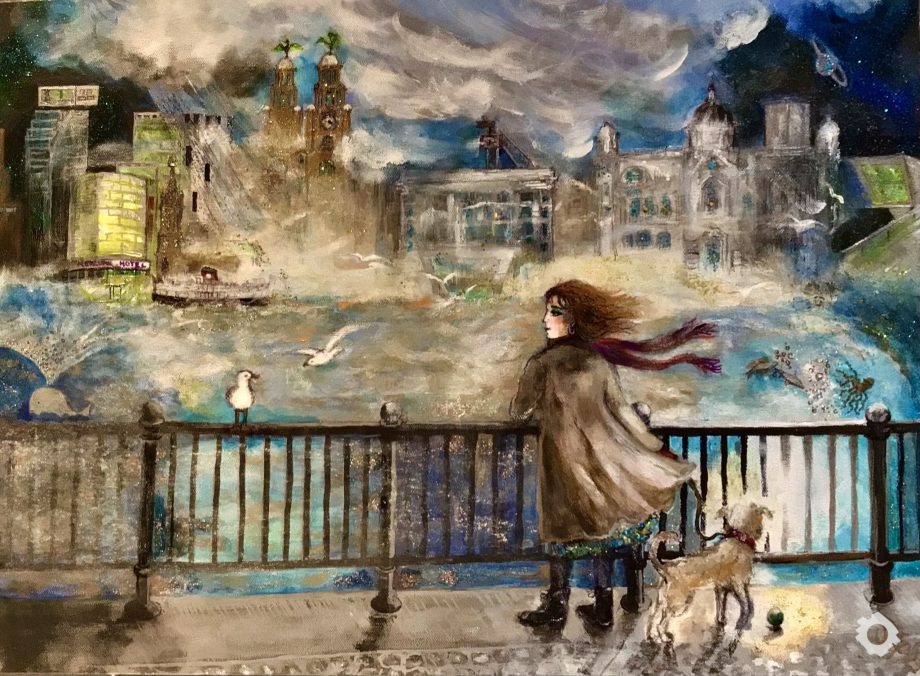 SKU: Breezy mersey Category: Susan Finch Tags: breezy, dog, ferry, figure, liverpool, mersey, mixed media, paper, river, scene, The Three Graces, waterfront, wind, woman