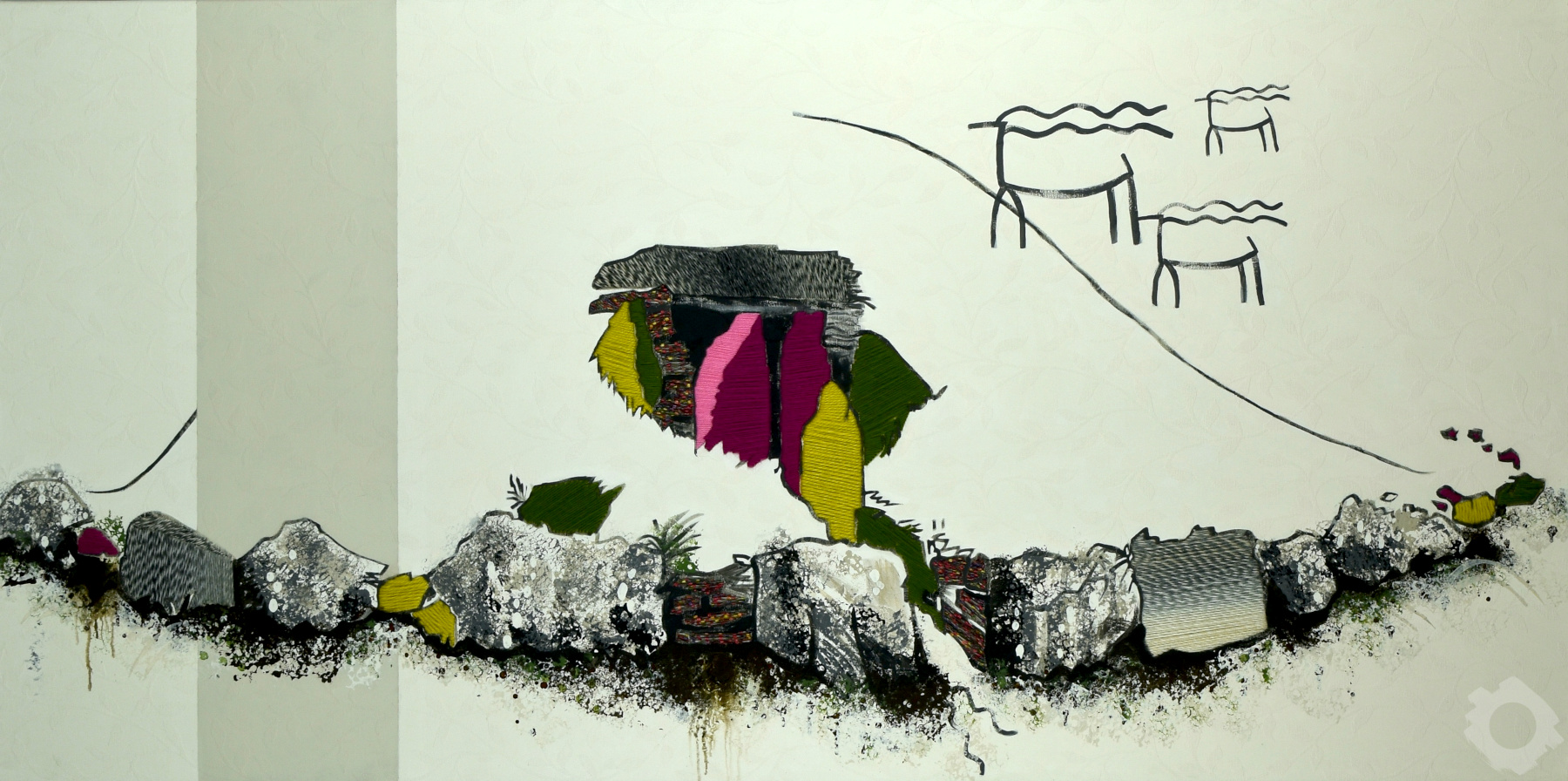 Acrylic and wool on upholstery fabric.