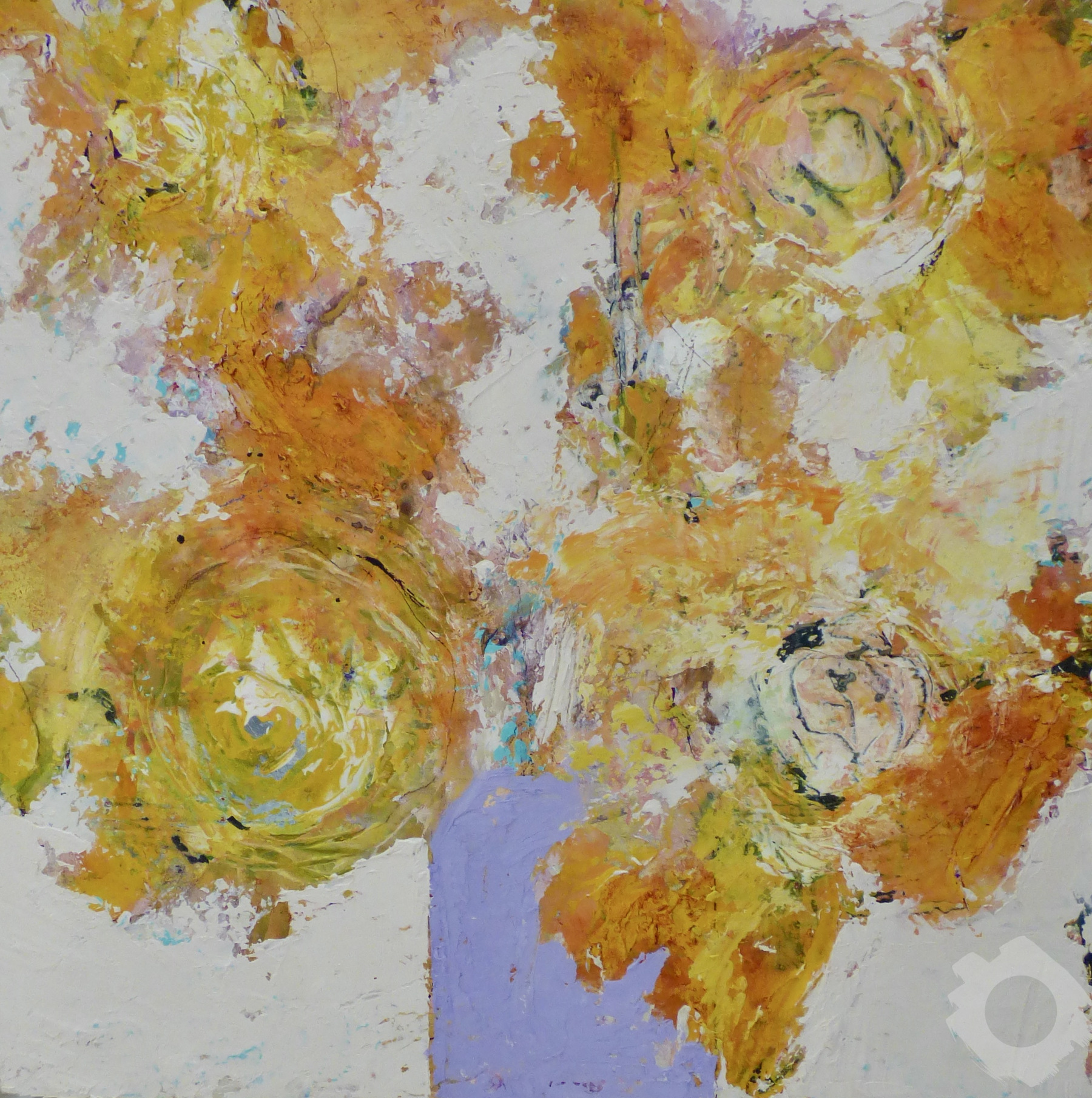 Oil and cold wax on board. Framed in a black, wooden box frame.