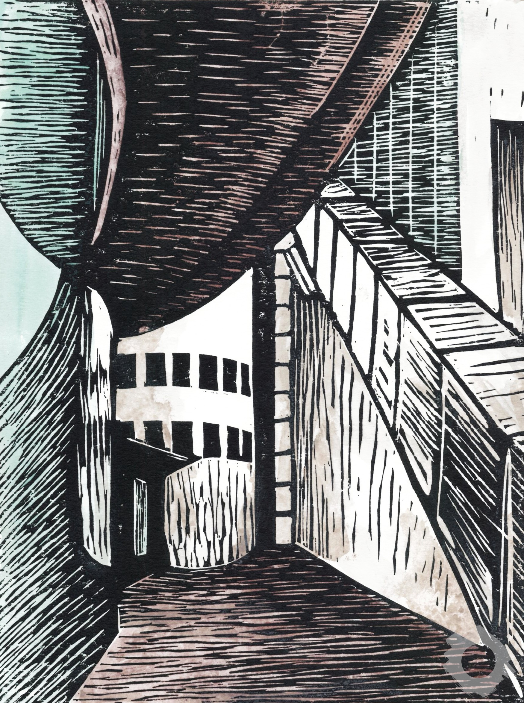 “My landscapes always start with drawing to help me understand the rhythm of light and perspective that I translate into mark making. I love the strong contrasts of lino printing in combination with a muted watercolour wash.”
