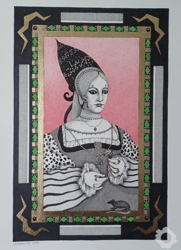 Zoe is also developing her practice into portraiture. The series blends contemporary figures with Tudor and Elizabethan influences, created in fine line pen and coloured pencil with touches of gold leaf. These works have led to commissions, including one from an emerging jazz duo.
