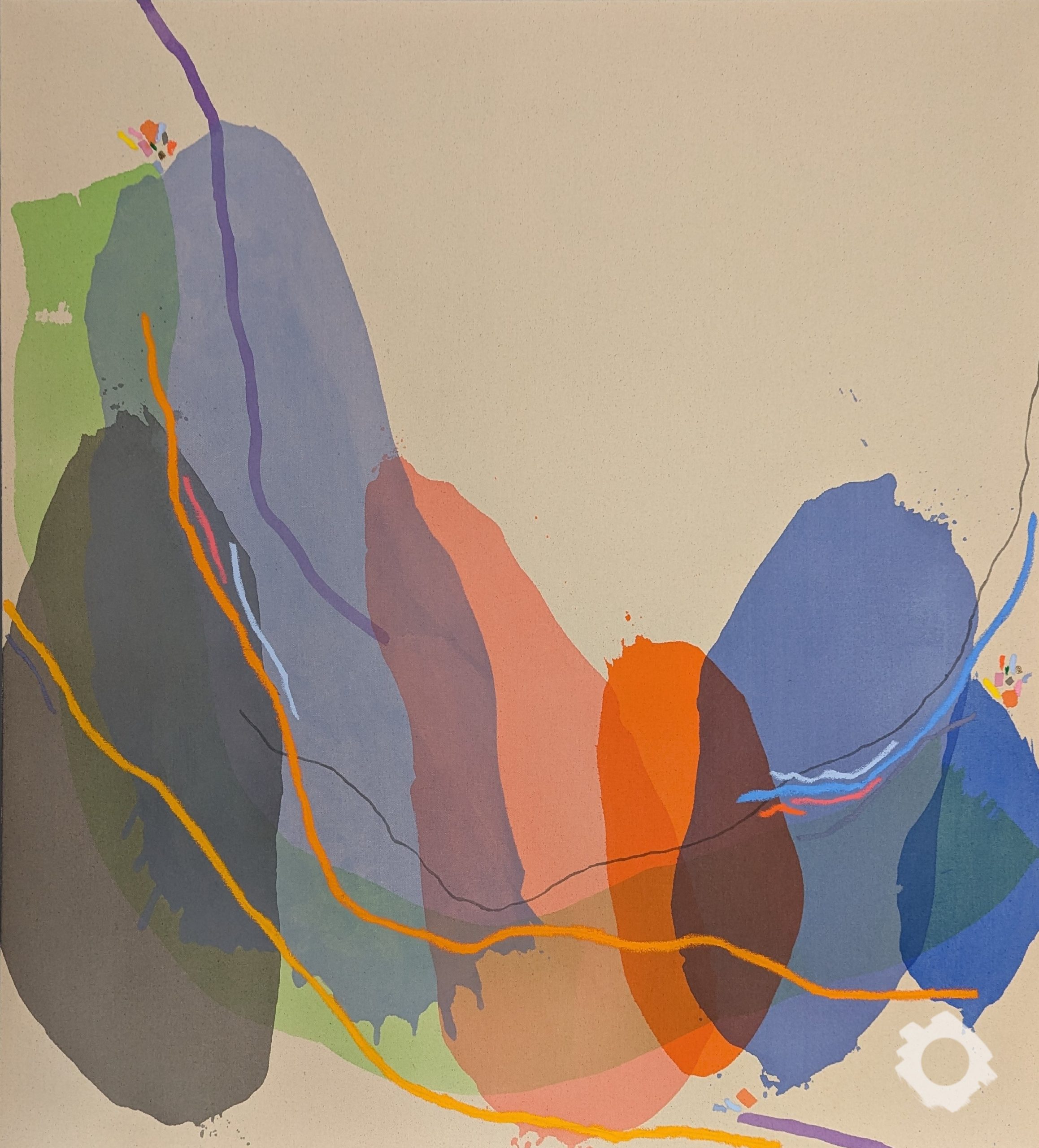 ‘Nature plays a big role in my creation process. I am inspired by the lines, edges and colours that I see when I am out exploring as well as the experience along the way. I often find myself lost in simplifying the forms in my head. I try to translate this to my art by letting the mediums consume a surface or interact with other colours, with little or no interference into the movement. This fascinates me, as this process gives the potential outcome an ambiguity which is most intriguing. This is in complete contrast to the line work which is very purposeful and rigid which I always add last, it grounds the work and gives it solidity and balance.