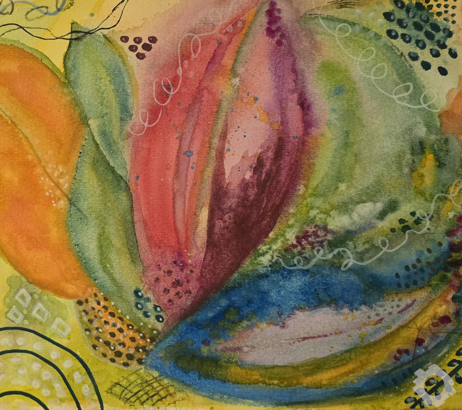 Spring Awakening captures the gentle moment when nature begins to stir after winter. Painted in watercolour, vibrant colours and organic, petal-like forms suggest fresh growth and renewal, while delicate lines and textures evoke a garden quietly coming back to. Original unavailable, limited edition prints only.