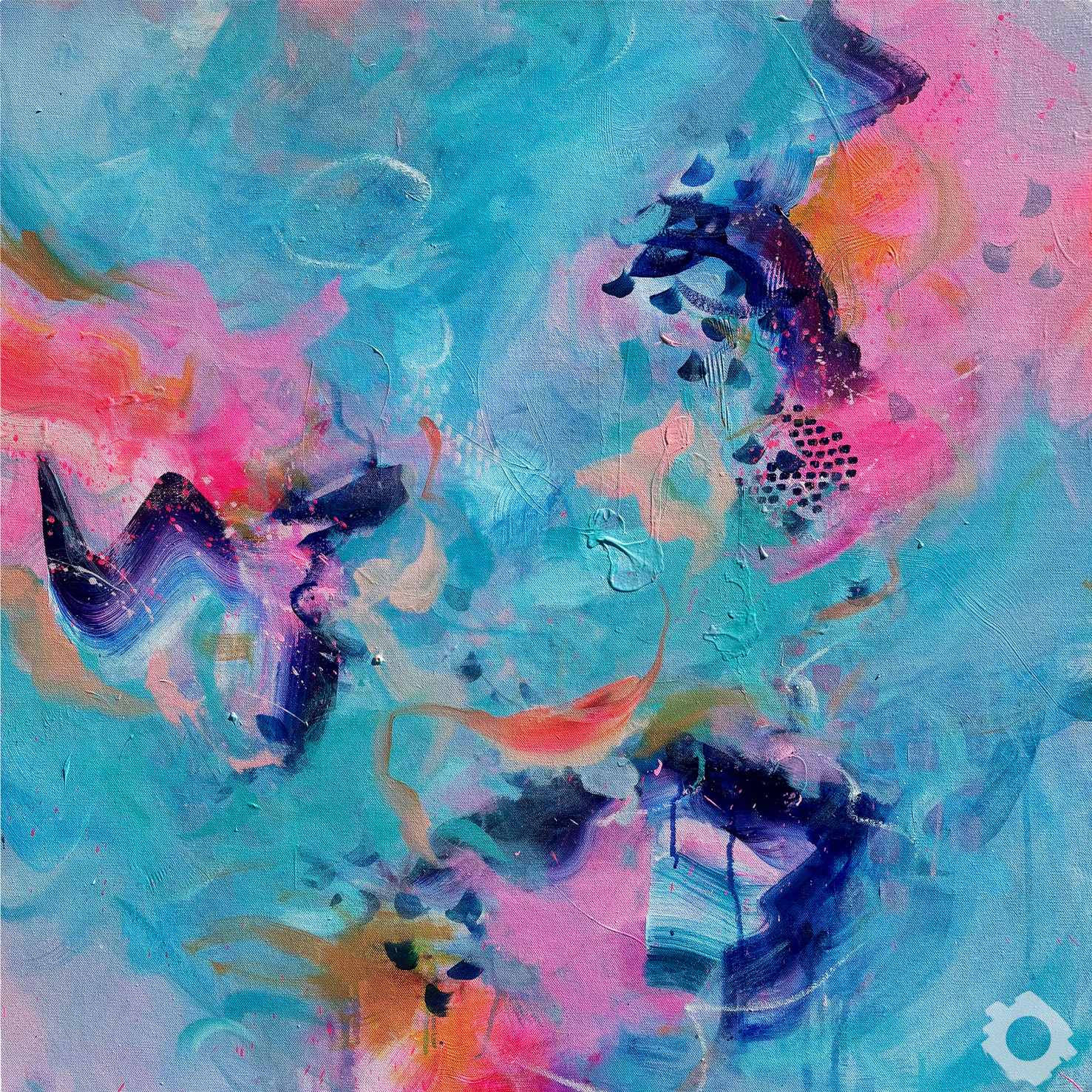 Sunshine On The Street is a large abstract expressionist painting inspired by the dancing sunlight when walking down the street with a skip in your step. This artwork combines vibrant turquoise with sugary pastel hues, deep violets, zingy oranges and neon pinks that create a dynamic and energetic painting that will give you a new lease of life at every glance. The multitude of textured layers and gradient brushstrokes create a lively painting that energises and inspires.