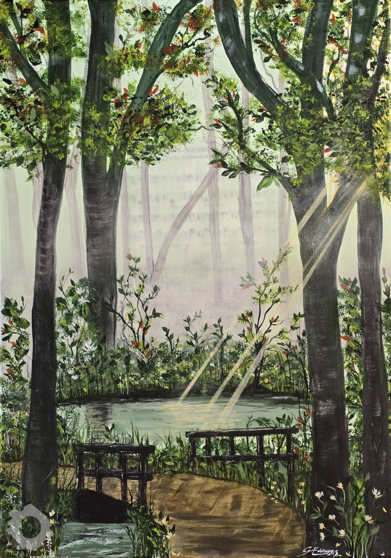 Symphony of the Forest captures a quiet moment where nature composes its own music. Soft light filters through towering trees, dancing across water and woodland paths, while hidden notes of birdsong and rustling leaves seem to linger in the air. The scene invites stillness, reflection, and a gentle return to harmony.