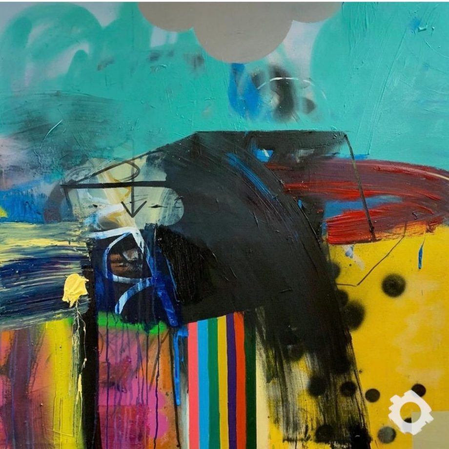 SKU: TOWER Category: Nathan Pendlebury Tags: abstract, cloud, colourful, mixed media, Pop, scene, sky, teal, tower, yellow