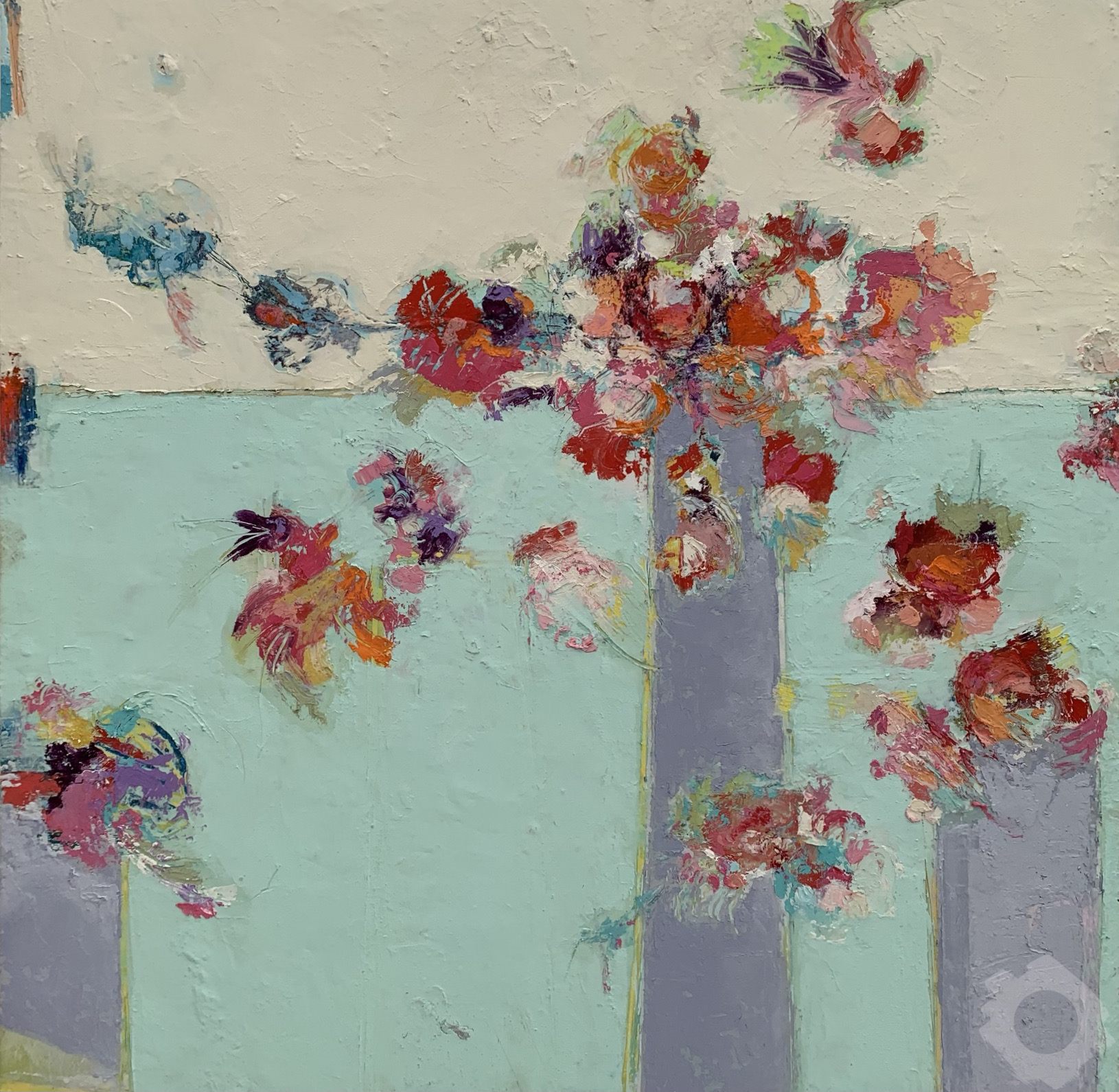 Oil and cold wax on board. Framed in a black, wooden box frame.